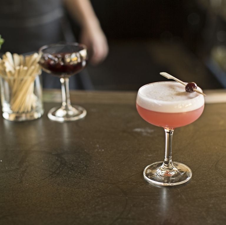 Combine all ingredients in a cocktail shaker and dry shake for 10 seconds.Add ice and shake vigorously until well chilled. Strain into a coup glass.Top with 2 dashes of aromatic bitters. Garnish with a brandied cherry.