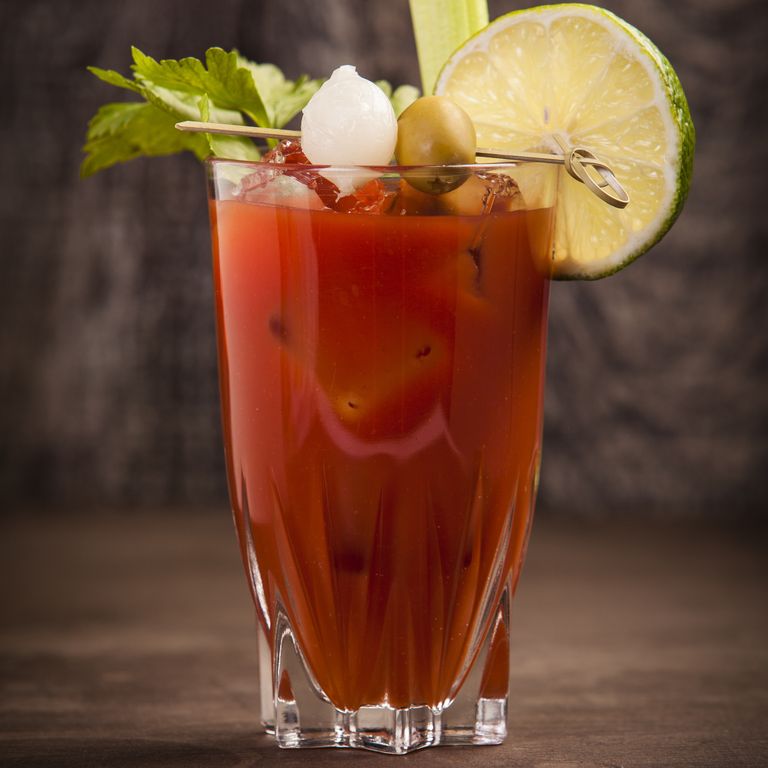 Shake all ingredients over ice and then pour into a pint glass. Garnish with celery stalk, bacon, lemon wedge and green bean.