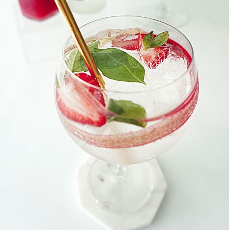 Seasonal Garnishes (we used peeled rhubarb, strawberry and basil)
